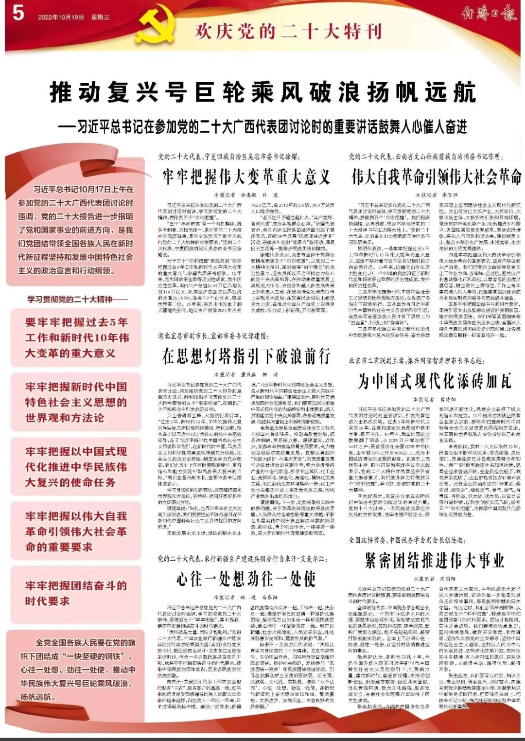 本文原载《经济日报》「欢庆党的二十大特刊」推动复兴号巨轮乘风破浪扬帆远航——习近平总书记在参加党的二十大广西代表团讨论时的重要讲话鼓舞人心催人奋进(2022年10月19日)